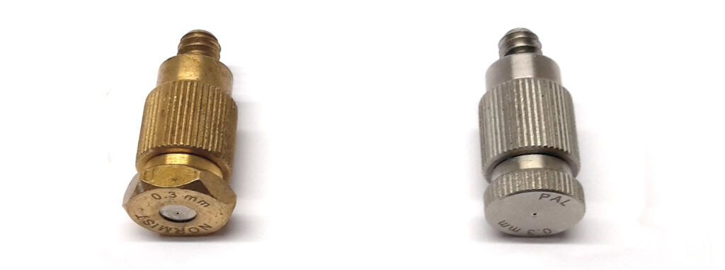 Bei der Düsengröße gibt es ebenfalls verschiedene Varianten, gängig sind 0,2- bzw. 0,3mm-Düsen. Diese haben eine maximale Leistung von 5,3 bzw. 6,3 Liter Wasser pro Stunde. Bei den größeren Düsen ist man flexibler in der Anwendungsmenge und die Gefahr von Verstopfungen ist geringer.